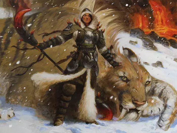 劍齒虎跳到她身旁,嗅著她的氣息,然後轉過來對著薩坎咆哮。薩坎用了十倍的強度向牠咆哮回去,吐著冰冷的氣息,他的手腳則擺出了挑戰的姿勢。大貓退縮了,緩慢地低下頭勉強屈服,並待在牠那不省人事的主人身邊。