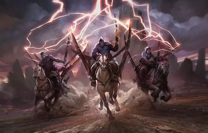 天空傳來一陣霹啪聲響。只走了三步,野山羊突然在半途向前傾倒。歐銳從獸鞍上重重跌落,昇起的地表砸上了他的下巴使他緊閉。當他慌忙地爬到野山羊後方以作為掩蔽時,他嚐到了鮮血的味道。野山羊則倒在地上死去,背上還插了一把長矛。閃電能量仍然沿著矛桿跳躍,使周圍的毛皮捲曲焦黑。