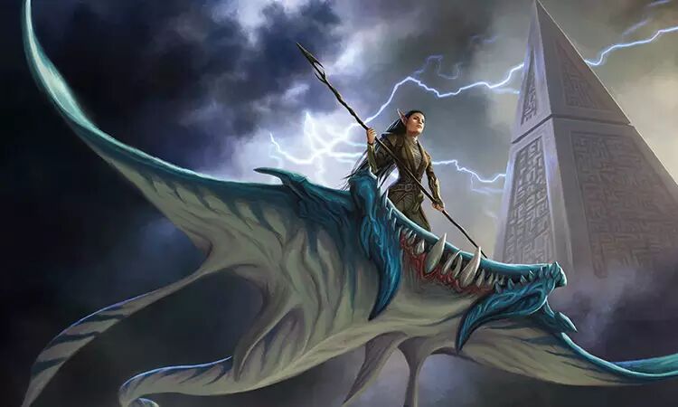 基定往後退了一步,同時有一隻巨大的藍白色鰩魚從天而降並盤旋在他前方大約一條手臂長度的位置。騎在牠背上的妖精看起來有點格格不入,但還不致於令人不舒服。她直挺挺地跪著。她高舉的手裡握著一把長矛。