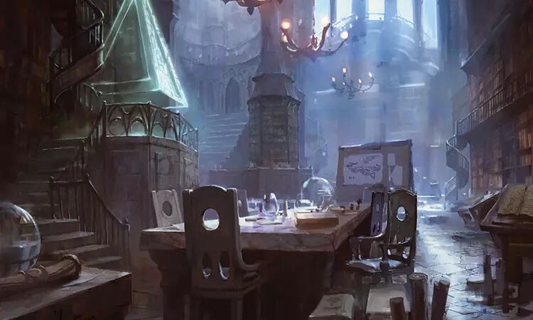上方是一座高聳入雲的石塔,往地上接近,它看起來就像是他在拉尼卡的聖所。大型的石桌上有一堆堆的書籍、地圖、還有幾個…發出嗡嗡聲的新發明。觸目所及四處是堆滿書的書架,他渴望地看著它們。那不只是看起來像他在拉尼卡的房間…它根本就是,唯一不同的是在拉尼卡,房間中央沒有宏偉的樓梯間螺旋往下。