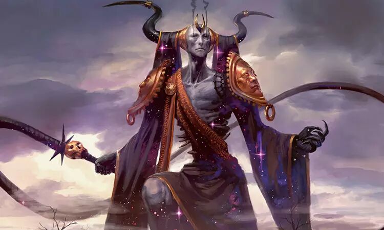 這幅景象中的中心人物是基定,他正擺出架勢,對抗某種矗立在他上空的存在。就如字面上的意思-一個由星光點點的夜空所形成的形體。這個空中形體有兩隻黑色的巨角,與一個藍色、非人類的臉孔。他揮動著一把大到難以置信的鞭子,鞭柄上有一個人類的頭骨。基定看起來就像是典型的他,方下巴、金色軟圈劍、穿著閃閃發光的鎧甲。但他臉上的表情卻一點也不像傑斯曾經認識的基定,這位基定看起來很憂慮,幾乎可以說是害怕,那張臉上有著憤怒…但也有著恐懼。有趣。