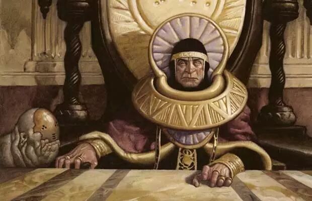 那个高位主教坐在一张黑色的岩桌后,椅子是金的并蚀刻着欧佐夫的标记,还放着奢侈的,绣花靠垫。一个索尔兽把一张椅子拉到波斯科身边,并飞快的逃回了天鹅窗帘后,然后又重新出现在主教的手肘边,打着呼噜,就好像它刚被喂了一盘葡萄。