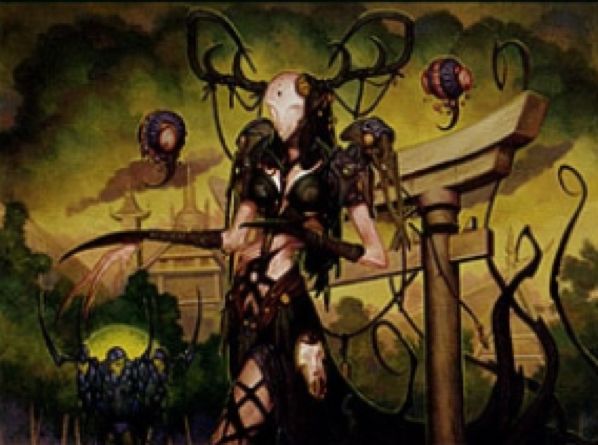 曾经的寺院大门早已沦为一片废墟,徒留下一片蛛网和碎砖瓦砾,如今那里却站着个人,其身形似有常人的三倍大小。来者体态纤细,恰如贵妇,一袭黑色的衣裙中裸露着苍白的四肢及小腹。她的脸是一张神色安详的面具,光滑无暇,却没有五官。于光秃秃的头顶两侧各生出一丛雄壮的鹿角,几枚带甲小球环绕着鹿角上下飞舞。